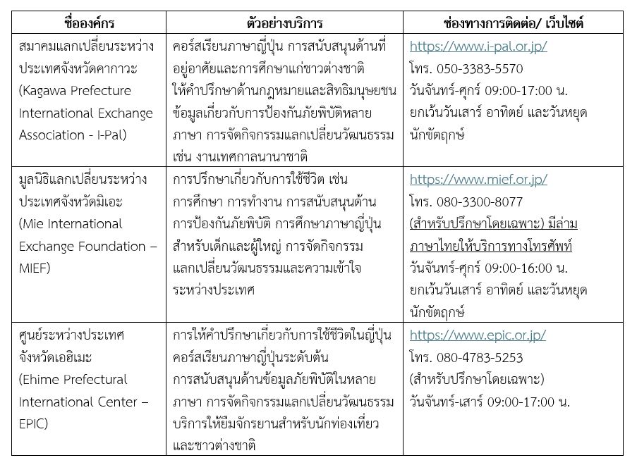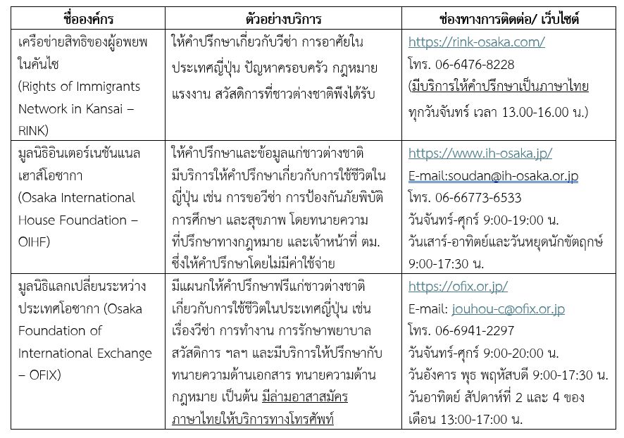 ในโอกาสนี้ สถานกงสุลใหญ่ฯ ขอประชาสัมพันธ์ข้อมูลที่เป็นประโยชน์ขององค์กรข้างต้นซึ่งคนไทยสามารถติดต่อเพื่อขอรับบริการได้โดยไม่มีค่าใช้จ่าย อาทิ คำแนะนำเกี่ยวกับการดำรงชีวิต ภาษา และการศึกษาในญี่ปุ่น และคำปรึกษาเบื้องต้นเกี่ยวกับประเด็นครอบครัวและกฎหมายแรงงาน